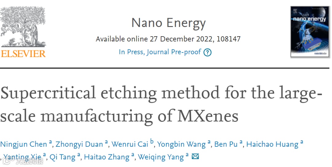 MXenes作为一种新兴的二维材料,在储能、传感等领域受到了广泛的关注。但极具危险性的含氟酸刻蚀法耗时超长,有甚者多达数天,且产量低(⁓1g),这从根本上制约了MXenes的大批量制备和商业化应用。
