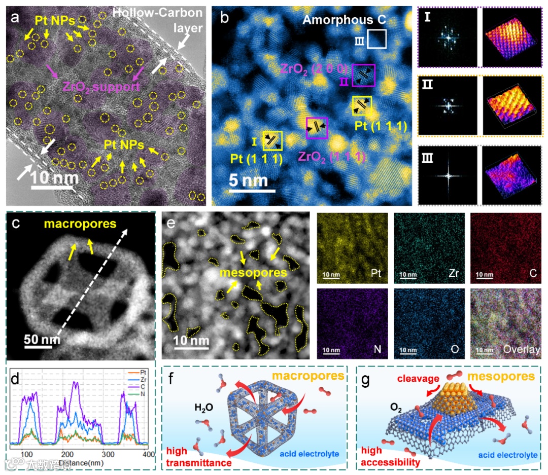 图2. (a)Pt-Zr FW@NC的HRTEM图像;(b)Pt-Zr FW@NC的AC HADDF-STEM图像及其对应的快速傅里叶变换(FFT)模式,三维原子重叠高斯函数拟合映射(Ⅰ: ZrO2 NPs,Ⅱ: Pt NPs,Ⅲ:非晶态碳)。(c-d)Pt-Zr FW@NC的HADDF-STEM图像和线扫图;(e)局部Pt-Zr FW@NC的HADDF-STEM图像和EDX映射;(f-g)Pt-Zr FW@NC大孔和介孔在电化学环境中的传质机理示意图。