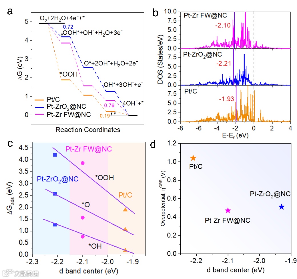 图5. Pt-Zr FW@NC,Pt-ZrO2@NCH和Pt/C的(a)ORR自由能图;(b)总态密度和对应的d带中心,Femi能级用黑色虚线标记,d带中心用紫色线标记;(c)催化剂上ORR中间吸附自由能的变化;(d)理论过电位与对应d带中心的关系。