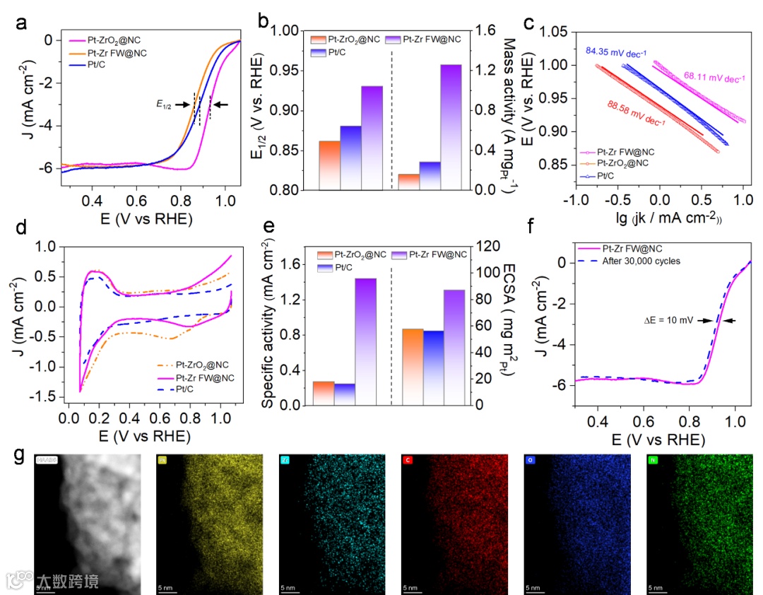 图4. Pt-Zr FW@NC, Pt-ZrO2@NC和商业Pt/C的(a)线性扫描伏安(LSV)曲线;(b)在0.9 V vs. RHE时半波电位(E1/2,左)和质量活性(MA,右)的比较。(c)Tafel图;(d)循环伏安(CV)曲线;(e)在0.9 V vs. RHE时比活性(左)和ECSA(右)的比较;(f)Pt-Zr FW@NC ADT前后的ORR极化曲线和(g)ADT后Pt-Zr FW@NC的元素分布映射图。