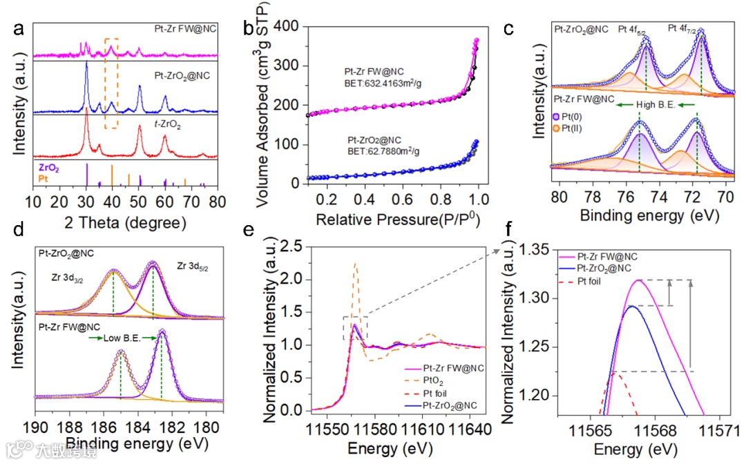 图3. Pt-Zr FW@NC和Pt-ZrO2@NC的(a)XRD图谱;(b)N2物理吸附等温线;(c)Pt 4f XPS;(d)Zr 3d XPS;(e)Pt L3边NEXAFS光谱和(f)Pt L3边WL峰的放大图像。