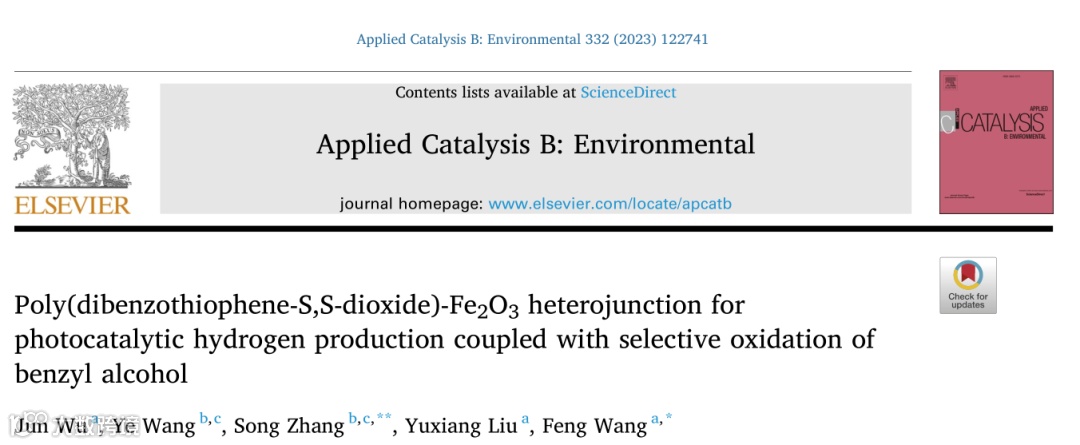 武汉工程大学汪锋教授课题组在Applied Catalysis B: Environmental上发表了题为“Poly(dibenzothiophene-S,S-dioxide)-Fe2O3 heterojunction for photocatalytic hydrogen production coupled with selective oxidation of benzyl alcohol”的研究论文。
