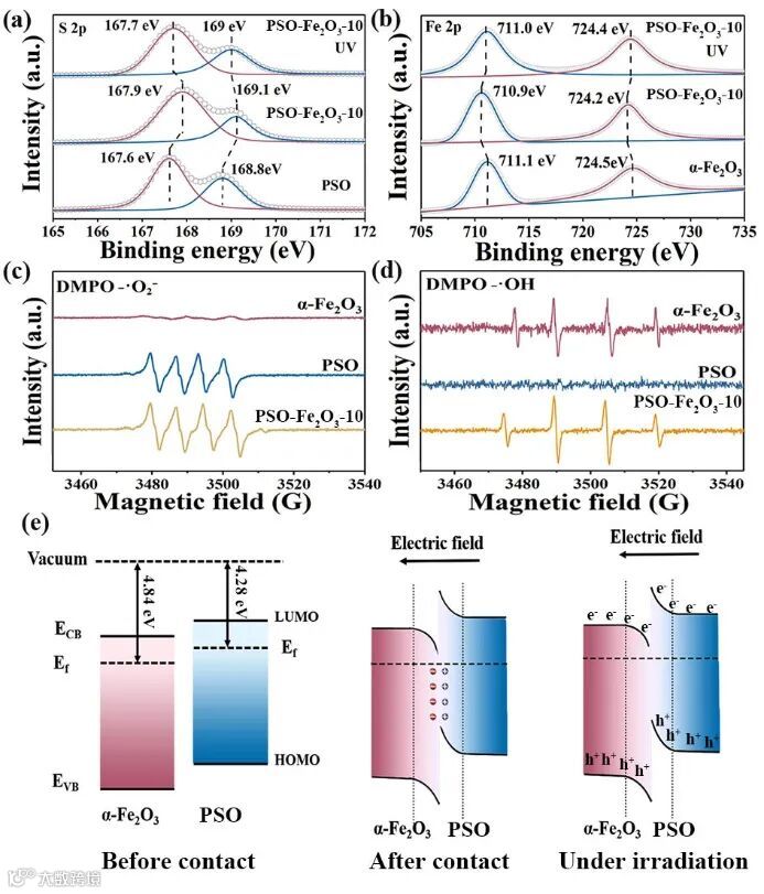采用原位Suzuki偶联聚合制备了一系列PSO-Fe2O3复合材料。图1a,b显示了原位XPS测试结果,PSO-Fe2O3-10在接触界面处形成了内建电场,光生电子由α-Fe2O3向PSO转移。随后利用EPR技术(图2a,b),对可见光下超氧基自由基和羟基自由基进行了测试,证明了PSO-Fe2O3-10具有较强的氧化还原能力。根据费米能级差,能带弯曲及光生电子转移方向证明PSO-Fe2O3异质结符合Z型电荷转移机制,能够有效地促进光生电子-空穴的分离,进而提高光催化活性。