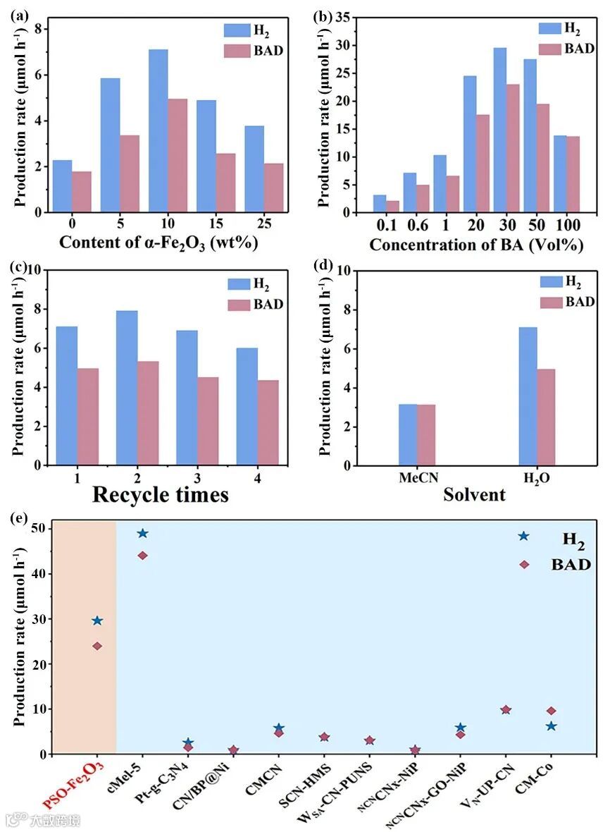 PSO-Fe2O3异质结在光催化制氢耦合苯甲醇氧化中表现出优异的光催化活性,其中PSO-Fe2O3-10在最佳条件下,氢气和苯甲醛的生成速率分别为29.5 μmol h−1和23.1 μmol h−1,高于绝大多数有机-无机复合材料。有趣的是,与相应的乙腈介质相比,PSO-Fe2O3复合材料在水溶液中具有更高的光驱动苯甲醛转化效率,说明苯甲醇与水共存可以促进光催化析氢和选择性氧化苯甲醇生产苯甲醛。