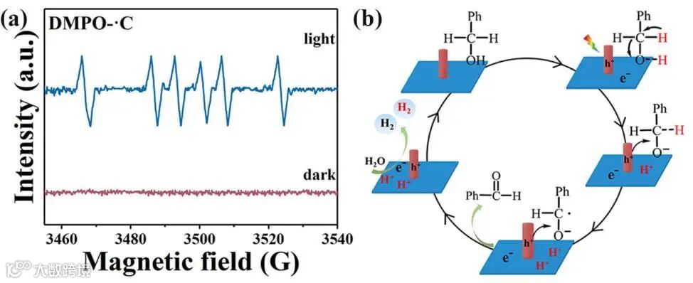 电子自旋共振谱表明反应过程中产生了碳自由基。此外,同位素实验证明在苯甲醇水溶液的反应过程中,氢质子来源于苯甲醇脱氢氧化和水还原。根据上述实验结果,提出了光催化制氢耦合苯甲醇氧化的可能机理,在光照射下,α-Fe2O3的光生电子与PSO的光生空穴复合。与此同时,光催化剂表面的一个活性苯甲醇分子被空穴氧化脱去质子,生成一个醇氧阴离子和一个质子。随后,光生空穴与醇氧阴离子反应生成相应的碳自由基和质子。碳自由基进一步氧化形成苯甲醛,两个质子或水与电子反应,同时生成氢气。