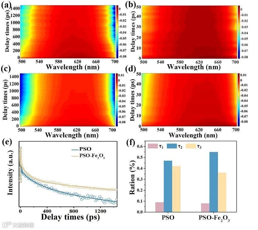 瞬态吸收光谱研究了PSO-Fe2O3异质结在皮秒尺度上的电荷传输动力学。相较于PSO,PSO-Fe2O3-10中具有更高效、更快的电子转移。高效的电荷分离和快速的电子俘获抑制了电荷复合,能够有效地提升光催化活性。
