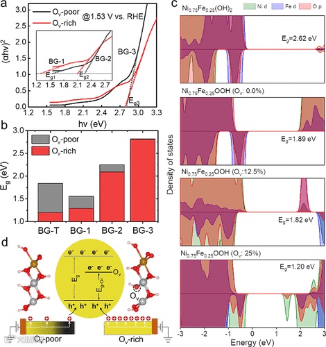 Figure 5. Electronic structures of Ov-rich NiFe LDHs and Ov-poor NiFe LDHs. (a) Tauc plots of the UV–vis spectra at the potential of 1.53 V vs RHE. (b) Bandgaps corresponding to theoretical BG-T and experimental BG-1, BG-2, and BG-3. (c) DFT calculation on the density of states. (d) Proposed mechanism for the promoted charge transfer.