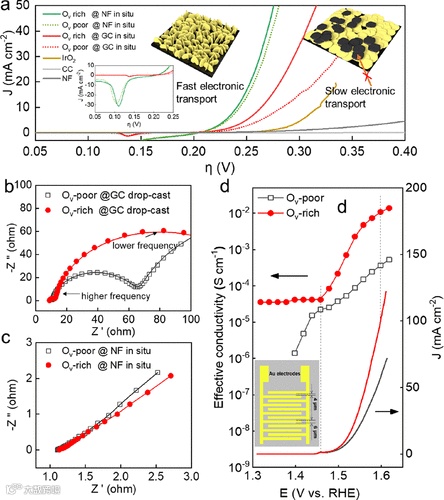 Figure 3. Electrocatalytic activities of Ov-rich NiFe LDHs and Ov-poor NiFe LDHs. (a) LSV scans and (b, c) Nyquist plots on (b) glassy carbon (GC) electrodes and (c) self-supporting electrodes of NFs. The catalysts were drop-casted on a glass carbon (GC, loading of 50 μg cm–2) electrode and were in situ grown on self-supporting electrodes. No carbon was added to the ink of catalysts for the catalyst drop-cast. Insets in (a) show the schematic diagrams of catalysts’ distribution on electrodes. The yellow sheets indicate fast electronic transport, and the black ones indicate slow electronic transport. (d) Dependence of conductivities on potentials measured on IDA electrodes. The inset shows the illustrative IDA electrodes.