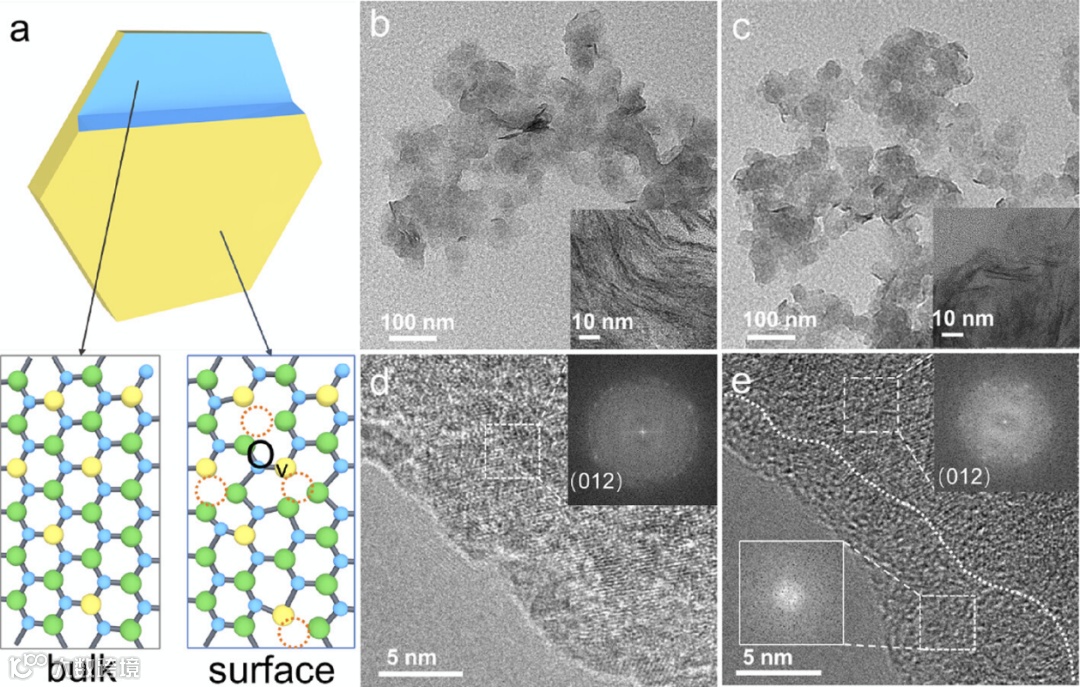 Figure 1. Microstructures of the Ov-rich and Ov-poor NiFe LDHs. (a) Schematic illustration of Ov-rich NiFe LDHs; (b, c) TEM and (d, e) HRTEM images of (b, d) Ov-poor and (c, e) Ov-rich NiFe LDHs. The insets in (b, c) show the standing nanoflakes. The insets in (d, e) show the fast Fourier transform (FFT) images of the corresponding square regions.