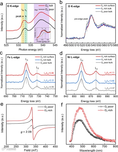 Figure 2. Characterization of Ov in Ov-rich and Ov-poor NiFe LDHs. (a) O K-edge XAS; (b–d) EELS spectra of (b) O K-edge, (c) Fe L-edge, and (d) Ni L-edge; (e) ESR spectra; (f) PL spectra.