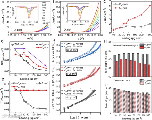 载量依赖的电化学数据显示,随催化剂载量不断提升,纳米片堆叠现象愈加严重,电荷传输能力更差的Ov-poor NiFe LDHs样品逐渐难以实现充分的性能表达,这反映在电化学性能随载量的缓慢非线性增长和高电流密度下偏移Tafel区的形成。Ov-rich NiFe LDHs样品由于具备更高的电荷传输能力,所以其电化学性能随载量快速提升。TOFredox的计算结果表明,随载量增加,Ov-poor NiFe LDHs的TOFredox值由~0.08s-1下降至~0.02 s-1,而Ov-rich NiFe LDHs的TOFredox值稳定在~0.08s-1。这进一步确认了电荷传输直接决定了催化剂中具有redox活性的金属位点的利用率。