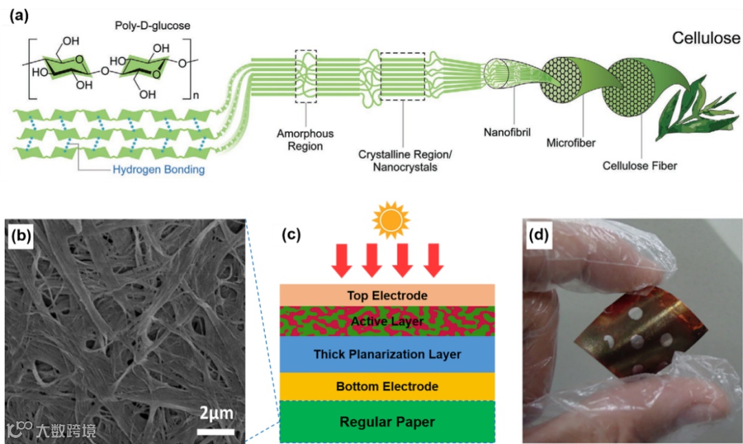图2 (a)纤维素聚集态结构,(b) 纤维素纤维扫描电镜图(c, d)基于普通纸张的柔性有机太阳能电池结构及实物图。