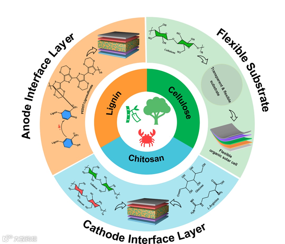 图1 纤维素、壳聚糖和木质素等天然材料作为有机光伏的柔性基底材料、阴极界面材料和阳极界面材料