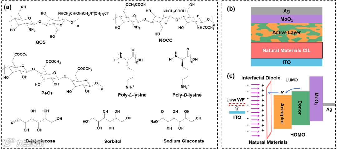 纤维素、壳聚糖、多肽和氨基酸等天然材料具有丰富的羟基(-OH)和氨基 (-NH2),这些极性基团可以和透明电极ITO或者金属电极(Al和Ag)产生界面偶极,降低电极的功函数,最终实现电子的提取。因此,天然材料可以单独作电子传输材料用于制备正向/反转有机太阳能电池,也可以作为ZnO修饰层用于制备反转器件。