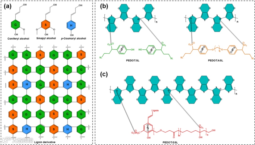 图4 (a)木质素结构举例,(b, c)PEDOT:木质素磺酸盐化学结构