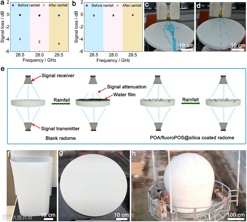 该涂层涂覆的5G天线罩在经过模拟降雨48h后几乎无信号损失,展现出优异的防雨衰性能(图3a,b),这主要归功于涂层的超疏水性,有效避免了降雨过程中水膜在天线罩表面的形成(图3c-e)。此外,该涂层被实际应用于5G天线罩/气象雷达罩的防雨衰并且在服役1年后仍展现出优异的防雨衰性能(图3f-h)。