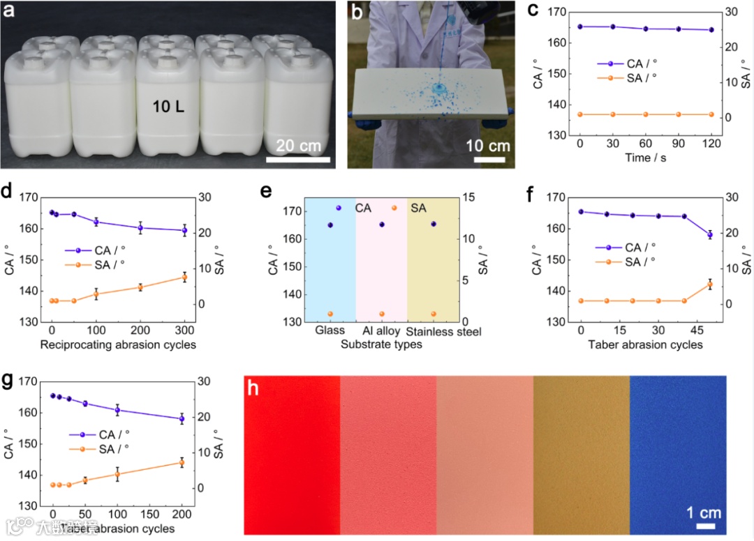 归功于简单的制备方法,该涂层能够被大面积制备并且大面积制备的涂层与实验室尺度的涂层具有相同的耐压性和机械稳定性(图2a-d)。该涂层还可用于玻璃、铝合金、不锈钢等基材(图2e-f)。此外,还得到了该涂层的衍生涂层。例如,通过引入粘结层,可得到机械稳定性更优异的超疏水涂层(图2g);通过引入色浆,可得到彩色的超疏水涂层(图2h)。