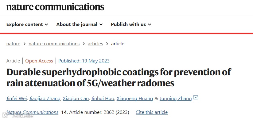 面向上述国家重大需求,来自兰州化物所张俊平研究员和魏晋飞博士,在国际知名期刊《Nat. Commun.》上发表题为“Durable superhydrophobic coatings for prevention of rain attenuation of 5G/weather radomes”的研究文章。该文章报道了一种兼具优异耐压性、机械稳定性和耐候性的5G天线罩/雷达罩超疏水防雨衰涂层,能够避免雨滴在5G天线罩/雷达罩表面粘附,有效解决了其“雨衰效应”,实现了该涂层在全国多地5G天线罩/雷达罩上的实际应用(图1-3)。