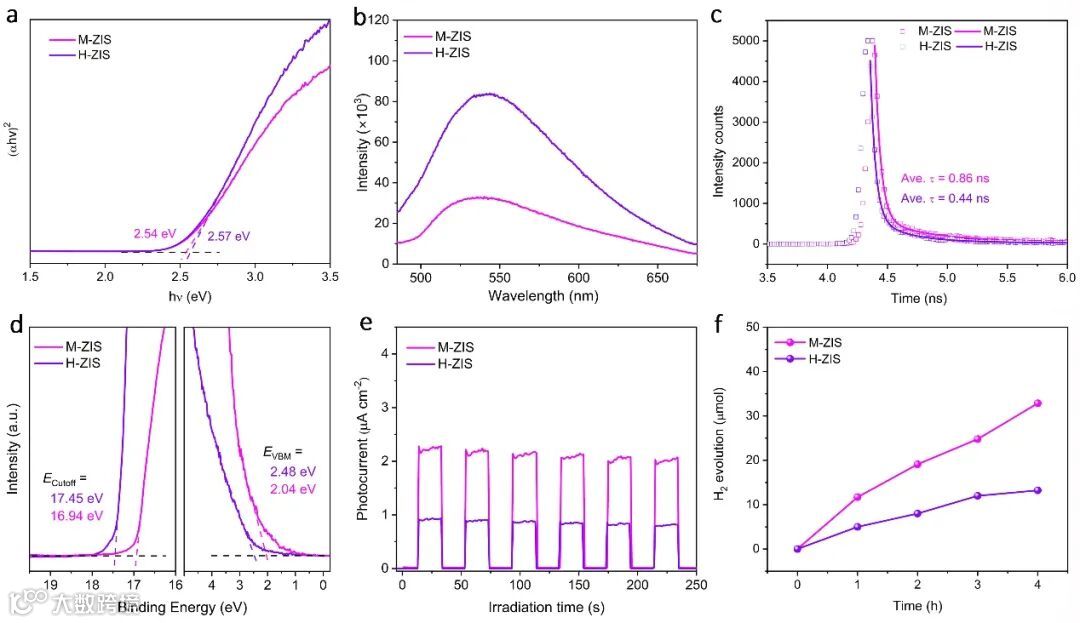 具有有序晶格和最小缺陷的M-ZIS有利于延长载流子的平均自由程和寿命,又有利于光生电子-空穴对的有效分离。H-ZIS的费米能级更接近CBM,这表明它具有更多的n型特性,这可以从含有更多S空位和自由电子的H-ZIS的缺陷性质中很好地理解。M-ZIS表现出比H-ZIS高得多的光电流,证明了其在光激发下更好的电荷分离。