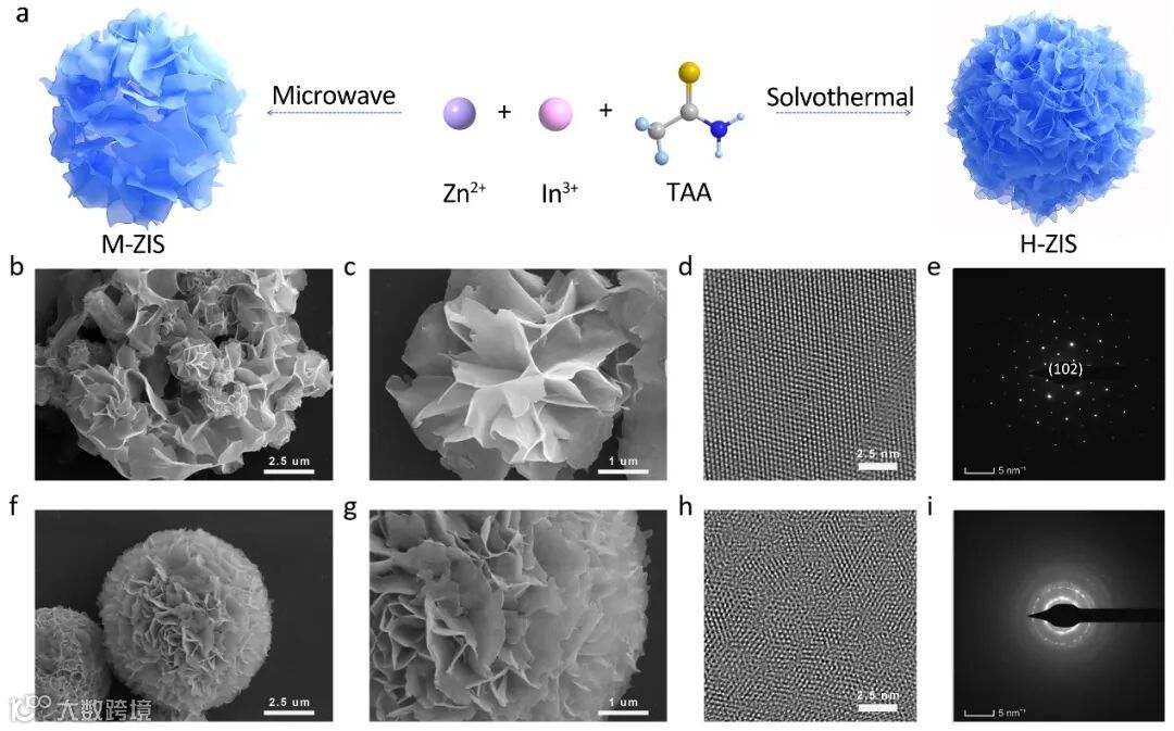 图1:通过微波辅助(M-ZIS)和水热(H-ZIS)方法制备的ZnIn2S4的形貌和微观结构。