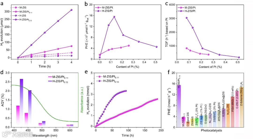 H-ZIS/Pt0.13在4小时内产生311.1 μmol的最高氢气产量,相较于原始H-ZIS和H-ZIS/Pt0.08的氢气产量高23.6倍和1.2倍)。进一步增加H-ZIS上的Pt负载量导致氢气产量下降。最初沉积在H-ZIS上的Pt助催化剂具有比在M-ZIS上高得多的活性,因此导致其性能与原始形式相比发生逆转。然而,当过量的Pt沉积在H-ZIS上时,如在H-ZIS/Pt0.51的情况下,氢的产量反而不及M-ZIS/Pt0.26。此外,H-ZIS/Pt0.13和M-ZIS/Pt0.11都表现出优异的光催化稳定性。