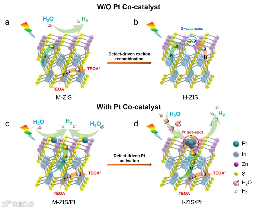 示意图:(a)M-ZIS具有几乎没有缺陷的完美晶格,(b)H-ZIS中缺陷诱导的光载流子复合,(c)ZIS和Pt之间具有弱耦合的M-ZIS/Pt,以及(d)H-ZIS/Pt上缺陷驱动的Pt活化的示意图。