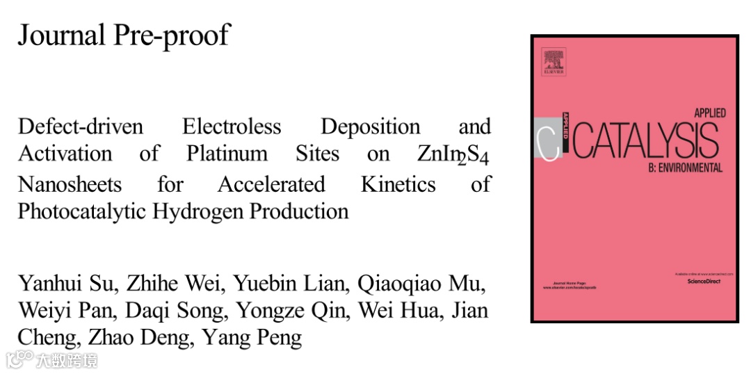 近日,苏州大学的彭扬教授团队在Applied Catalysis B: Environmental上发表题为“Defect-driven Electroless Deposition and Activation of Platinum Sites on ZnIn2S4 Nanosheets for Accelerated Kinetics of Photocatalytic Hydrogen Production”的文章。该文章报道了ZIS的空位和沉积的Pt原子/团簇之间的相互作用,二者紧密耦合不仅促进了光激发的电子-空穴分离,而且调节了局部电荷极化,以利用助催化剂的本征活性。
