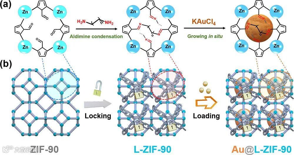图2. (a)醛亚胺缩合反应和Au NPs原位生长示意图。(b)Au@L-ZIF-90的合成过程。
