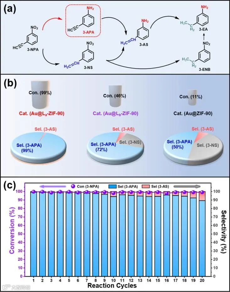 图3. (a) 3-NPA加氢总反应路径示意图;(b) Au@La-ZIF-90、Au@Lb-ZIF-90和Au@ZIF-90催化3-NPA选择性加氢的性能;(c)在Au@La-ZIF-90上进行的可回收性实验结果。