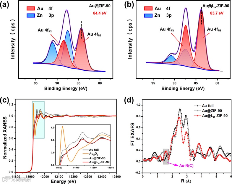 图4. (a) Au@ZIF-90,(b) Au@La-ZIF-90的Au 4f 的XPS光谱,(c) 归一化Au L3-edge XANES光谱,(d) 样品的FT k2-加权EXAFS光谱