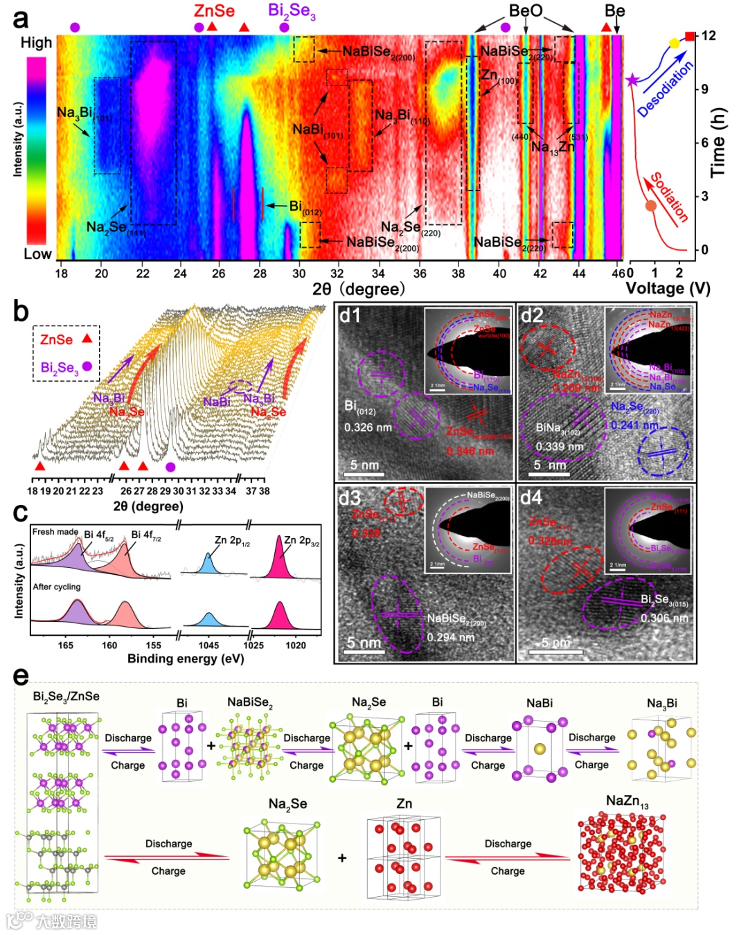 我们使用了原位XRD和非原位的TEM与XPS联用,证明了Bi2Se3和ZnSe的可逆储钠变化,对其多步的充放电产物进行了明确表征了和具体的充放电顺序进行了探究,充分证明了电极材料的可逆转变,为其他硒化物储能机理提供了参考。