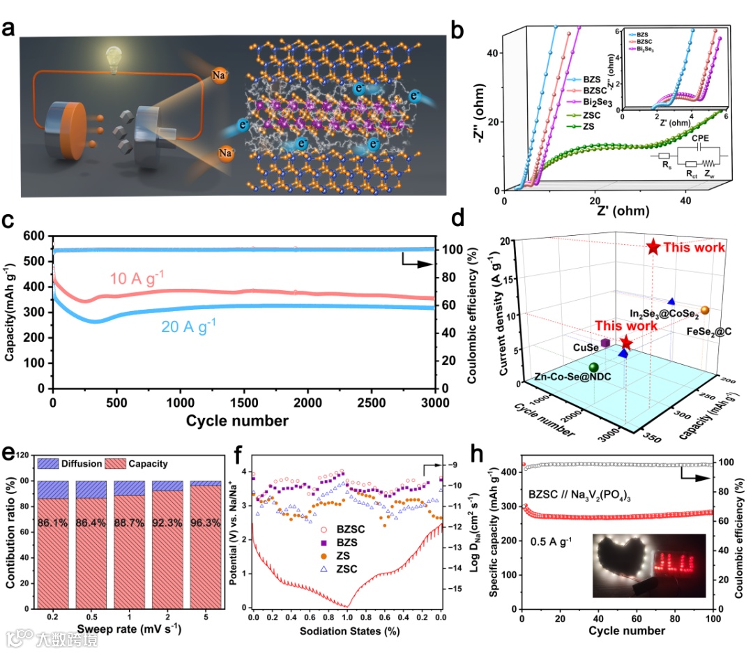 为了探讨获得的BZSC和对照组的电化学性能,电化学阻抗谱(EIS)(图3b)首先被用来获取各种负极材料的Nyquist图。基于等效电路模型,我们拟合了阻抗曲线,半圆的半径代表高频区电荷转移电阻(Rct)。Bi2Se3电极的Rct为2.61 Ω,表明其快速电荷传输能力。受益于Bi2Se3纳米板的导电平台效应和两种硒化物之间的亲密电子相互作用,BZS和BZSC异质结构体都表现出极低的Rct电阻,分别为0.4 Ω和1.1 Ω,大大低于对照组。基于阻抗结果,我们成功在电极中建立了一个快速电荷传导路径,这为快速充电提供了前置条件。