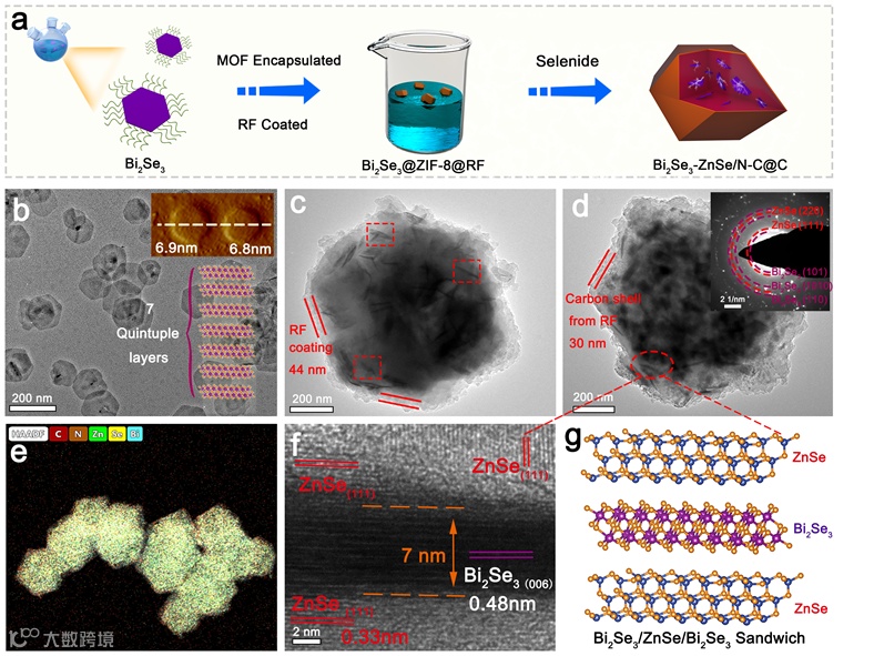 图1a示意了详细材料合成过程。合成聚乙烯吡咯烷酮(PVP)修饰的超薄六边形Bi2Se3纳米板。然后,纳米板被引入作为诱导MOF生长中心,并被封装在ZIF-8中。再经过硒化处理,我们得到了分级的Bi2Se3-ZnSe/N-C@C(BZSC)异质结构。相应的选区电子衍射图案证实了两相的共存,图1f中的高分辨TEM(HRTEM)说明了在异质面有两组不同的晶格,而其0.33和0.48纳米的面间距分别归因于ZnSe和Bi2Se3的(111)和(006)平面。基于实验结果,我们在图1g中示意性地显示了我们所构建的ZnSe/ Bi2Se3/ZnSe双硒化物异质结构的模型结构。