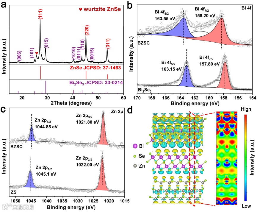在X射线光电子能谱仪测量(XPS)中,在Bi 4f的对比光谱中(图2b),位于158.20 eV和163.55 eV的峰被归于Bi 4f 7/2和4f 5/2的结合能。值得注意的是,与合成的纯Bi2Se3相比,BZSC的峰值向更高的结合能转移,显示出增强的电子耦合和电子流出倾向。ZIF-8衍生的硒化锌相比,Zn 2p光谱中的这两个峰值向低结合能转移,这表明电子是有从Bi2Se3迁移到ZnSe是倾向的。为了从理论上验证和研究异质结构中的电子云分布和内置电场效应,我们进行了密度泛函理论(DFT)计算。