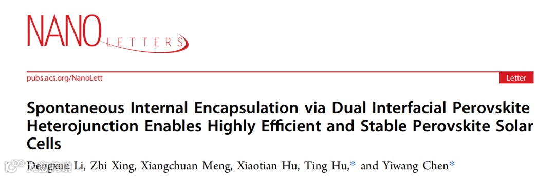 基于此,来自南昌大学的陈义旺教授与胡婷副教授合作,在国际知名期刊Nano Letters上发表题为“Spontaneous Internal Encapsulation via Dual Interfacial Perovskite Heterojunction Enables Highly Efficient and Stable Perovskite Solar Cells”的文章。该文章通过将二维钙钛矿组分与底部界面和顶部界面的三维钙钛矿活性层相互作用,构建了一个双界面钙钛矿异质结,从而实现了器件的自发内部封装。