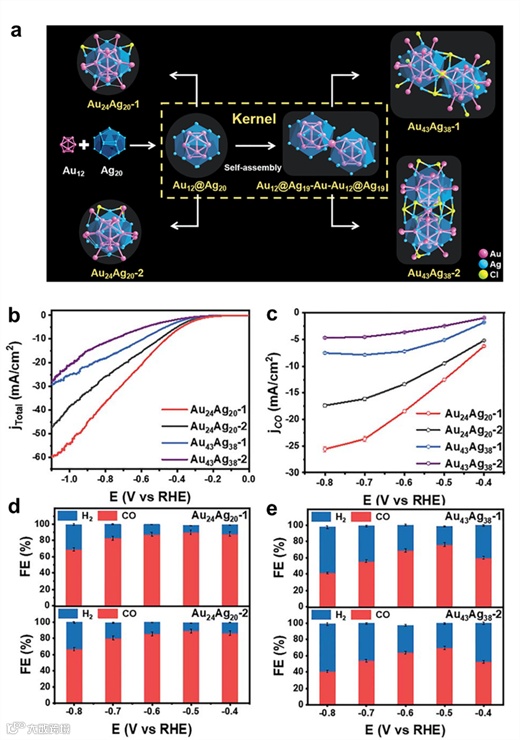 其他一些因素如金属配体之间的配位结构基元,团簇本身的聚集形态(单体或二聚体等)也会影响团簇的电催化CO2还原性能。如南京大学的祝艳教授课题组发现单体Au24Ag20(C12H13)24Cl2 (简称Au24Ag20-1)可以转化为Au43Ag38(C12H13)36Cl12 (简称Au43Ag38-1),而Au24Ag20(C9H7)24Cl2 (简称Au24Ag20-2)可转化为Au43Ag38(C9H7)36Cl9 (简称Au43Ag38-2),发表在Chem. Sci., 2022, 13, 2778-2782上。