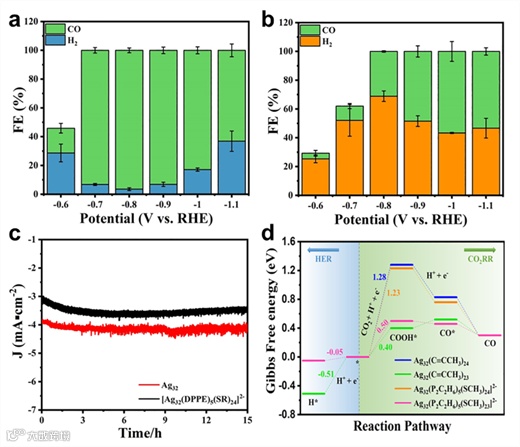 唐正华课题组近期报道的另一项研究中,讨论了Ag32纳米团簇在eCO2RR中的表面配体效应,发表在Nano Res., 2022, 15, 8908-8913上。他们首先制备了纯炔保护的Ag32(3,5-(CF3)2C6H3C≡C)24 (简称Ag32)团簇以及巯基和磷共保护的[Ag32(DPPE)5(SR)24]2-团簇。由于Ag可以与C≡C键之间的σ和/或π结合,因此Ag32比[Ag32(DPPE)5(SR)24]2-具有更多样的配体-金属界面结构基元。研究表明,这种结构的不同导致了eCO2RR性能的巨大差异。