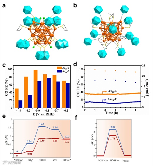 最近,郑州大学臧双全教授课题组报道了Au28团簇的配体-壳工程,其中Au28(C2B10H11S)12(tht)4Cl4 (简称Au28-S)和[Au28(C4B10H11)12(tht)8]3+ (简称Au28-C)虽然具有相同的金属核,但在eCO2RR中,Au28-S的催化性能明显优于Au28-C,发表在Angew. Chem., Int. Ed., 2022, 61, e202207492上。具体表现为,Au28-S在所有测试电位下的FECO值都较高,在-0.9 V时,其FECO最高可达98.5%,约为Au28-C的1.4倍,且两个团簇都表现出良好的稳定性。此外,作者还进行了DFT计算以揭示活性位点并阐明反应机理。