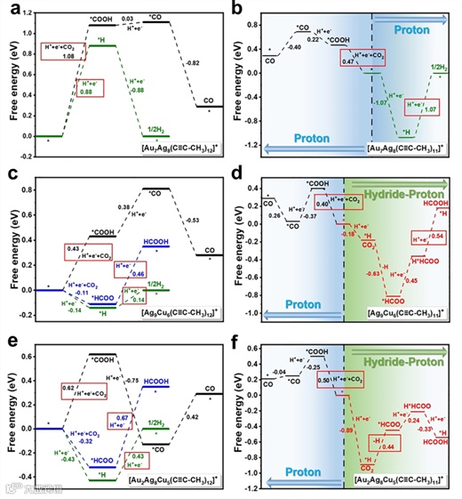利用单晶结构建立模型,重庆大学唐青课题组进行了DFT计算以揭示反应机理。结果显示,eCO2RR与HER在同一金属位点竞争,分别为Au7Ag8中的Au,Ag9Cu6和Au2Ag8Cu5中的Cu,其中,金属核表面上的Cu作为HCOO*结合的活性位点,而*COOH、*CO、*H倾向于与次表面的Au原子结合。他们预测纳米团簇剥离一个配体后暴露的金属原子是活性中心。
