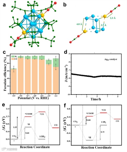 2021年,唐正华课题组合成了最小的纯炔保护的Ag15(C≡CtBu)12+ (简称Ag15)团簇,并将其应用于eCO2RR中,发表在Angew. Chem., Int. Ed., 2021, 60, 26136-26141(Hot Paper)上。Ag15具有Ag@Ag8@Ag6的体心立方(bcc)金属核结构。并且Ag15在单晶生长过程中会吸附空气中的CO2,从而导致其Ag8立方体中两个对角的Ag原子可以与CO2分子两侧的O原子相连,使Ag8立方体被拉长,最终组装成一维材料。Ag15在eCO2RR中的主要产物为CO,在-0.6 V时最大FECO可达约95%,并能显著抑制H2的析出。此外,Ag15催化剂在10小时内能保持良好的稳定性。