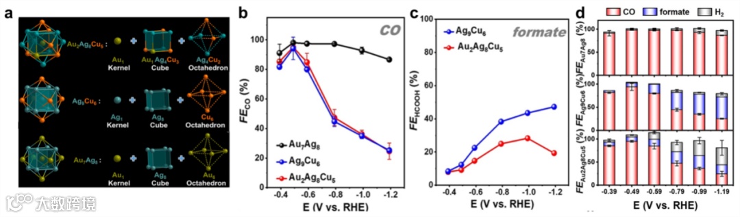 值得注意的是,虽然Au7Ag8、Ag9Cu6、Au2Ag8Cu5均为M15团簇,核构型相似,但它们的eCO2RR催化性能有很大不同。Au7Ag8对CO的形成具有很高的选择性,在-0.49 V时,FECO最高可达98.1%。Ag9Cu6、Au2Ag8Cu5的主要产物都是CO和甲酸盐,尽管它们的FECO与Au7Ag8呈相似的火山状,且在-0.49 V时FECO最高,分别可达94.1%和95.0%,但当电位越负时,FECO迅速下降。而对于甲酸盐,当电位为负时,Ag9Cu6的FEformate值持续升高,而Au2Ag8Cu5的FEformate值先升高后降低。Ag9Cu6和Au2Ag8Cu5在-1.19 V和-0.99 V时FEformate的最大值分别为47.0%和28.3%。