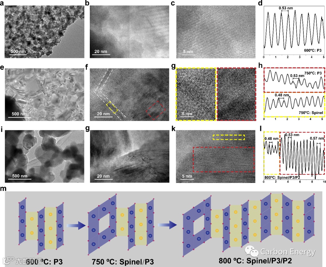 图2:P2/P3@spinel-NaMCM正极材料的形成过程。a-c) NaMCM-600的TEM图像。d)图2c晶面间距图。e-g) NaMCM-750的TEM图像。h)图2g中选定区域的晶面间距图。i-k) NaMCM-800的TEM图像。l)图2k的晶面间距图。m)不同煅烧温度下的结构转变示意图。
