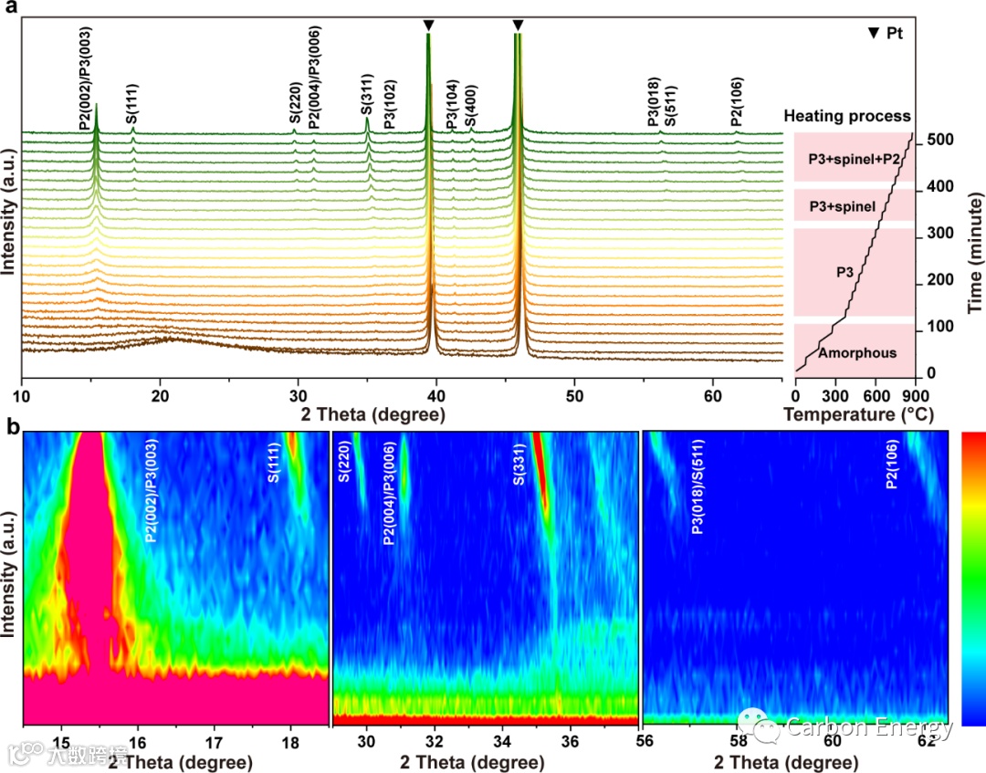 图1:煅烧过程中的结构转化。a) P2/P3@spinel-NaNCM正极材料前驱体煅烧过程中不同温度的原位高温XRD图谱。b)原位高温XRD二维图。