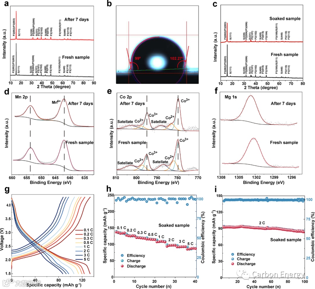 图6:P2/P3@spinel-NaMCM正极材料的空气稳定性。a)原始样品和暴露在空气中样品的XRD图谱。b)接触角测量。c)原始样品和浸泡样品的XRD图谱。原始样品和暴露在空气中样品的d) Mn 2p;e) Co 2p;f) Mg 1s高分辨率XPS谱。g)浸泡样品的充放曲线。h)倍率性能。i)浸泡样品2C电流密度下的循环性能。