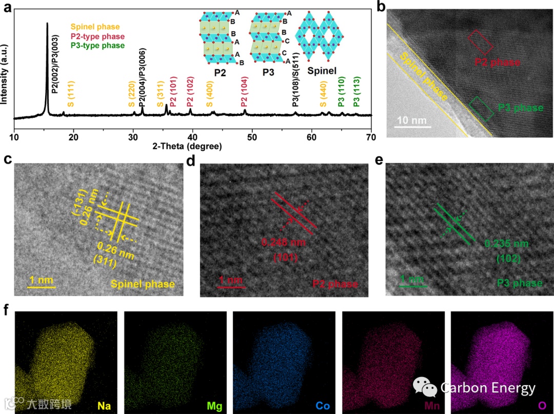 图3:P2/P3@spinel-NaMCM正极材料结构。a)XRD图谱。b) TEM图像。c-e) 分别为尖晶石结构P2和P3的HRTEM图像。f)元素的TEM-EDS分布图像。