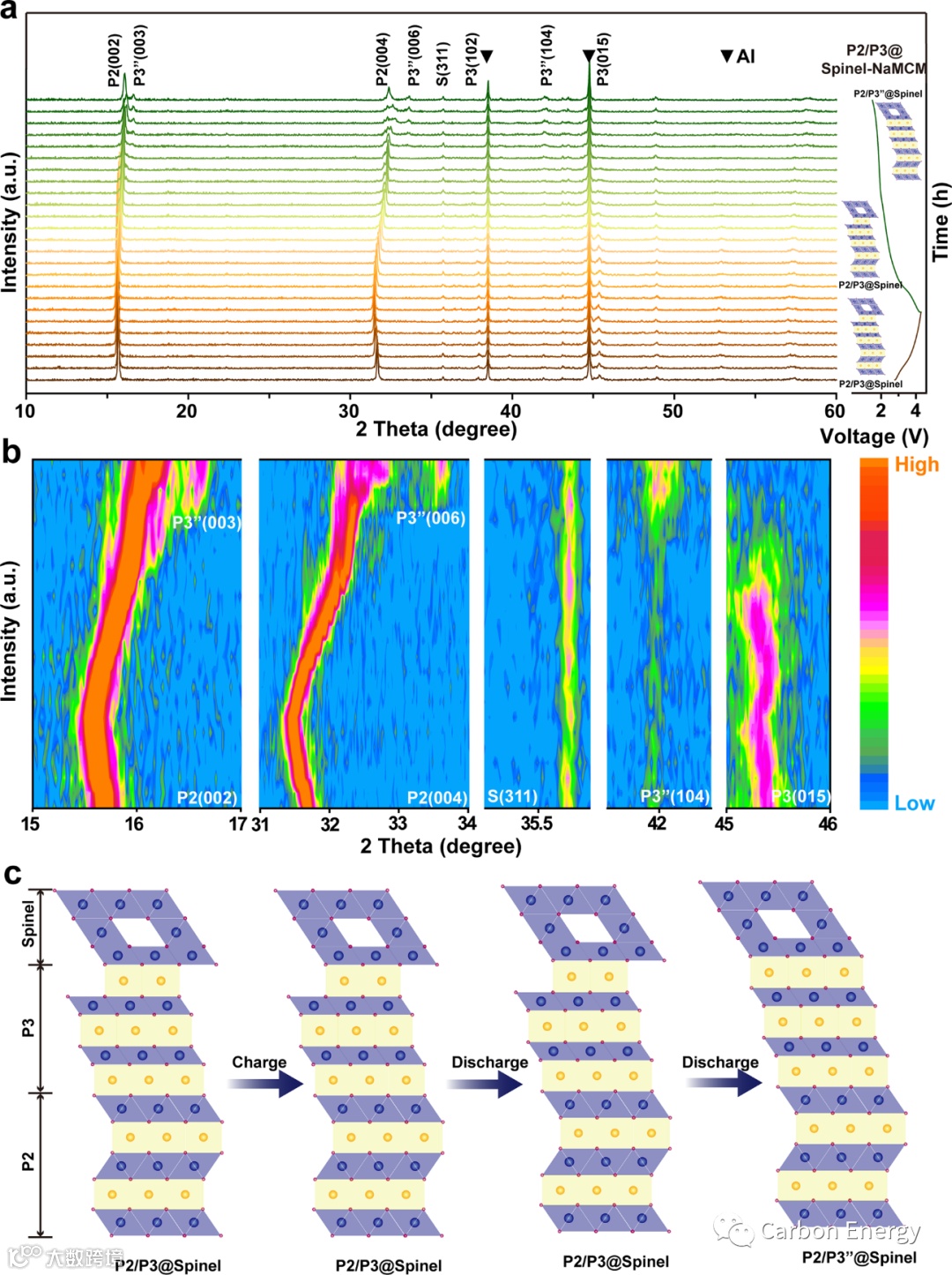 图5:P2/P3@spinel-NaMCM正极材料的动态结构演化。a) 0.1 C电流密度下1.5 - 4.3 V电压范围充放电过程的原位XRD图谱及b)相应的特征衍射峰强度等高线图。c)不同充放电条件下结构动态演化示意图。