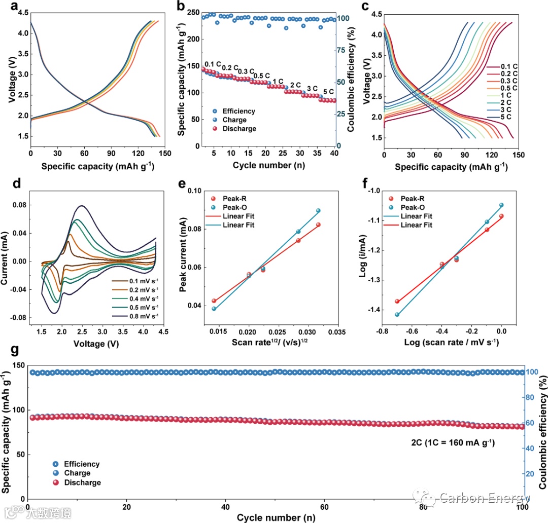 图4:P2/P3@spinel-NaMCM正极材料的电化学性能。a) 0.1C的充放电曲线。b, c)不同速率下的速率性能及对应的充放电曲线。d)不同扫描速率下的循环伏安图。e, f)峰值电流与扫描速率平方根的线性拟合,以及不同氧化还原峰值下的log (i)与log (v)曲线。g) 2C电流密度下循环性能测试。