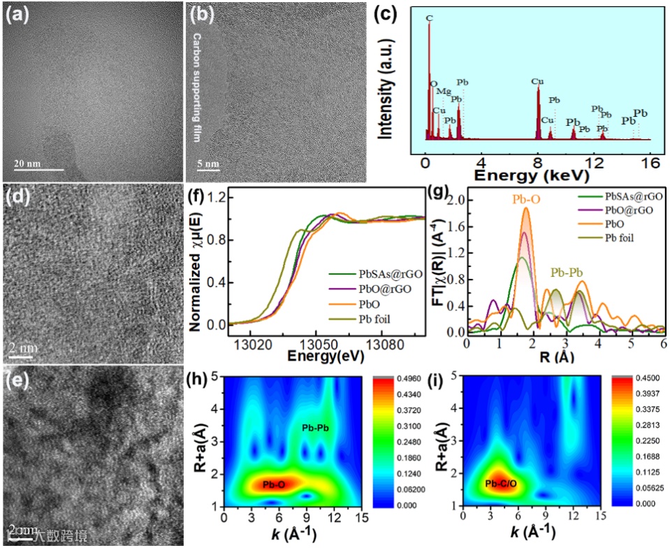 高角环形暗场(HAADF)图像显示,在由轻元素C和O组成的还原氧化石墨烯矩阵中有大量的原子级亮点,而这些亮点源于重原子Pb。PbSAs@rGO的FT-EXAFS光谱在r-空间中仅揭示了在1.66 Å处的一个强壳层,而只有单一的强壳层是无定形或结晶性差的材料的典型特征,证明Pb位点周围存在较大的结构无序,这与像差校正TEM和STEM中可以观察到大量缺陷是一致的。综述,通过两种像差校正的透射电镜(TEM和STEM)和基于同步加速器的x射线吸收精细结构光谱(XAFS)证实了锚定在还原氧化石墨烯上的铅确实是原子级分散的。