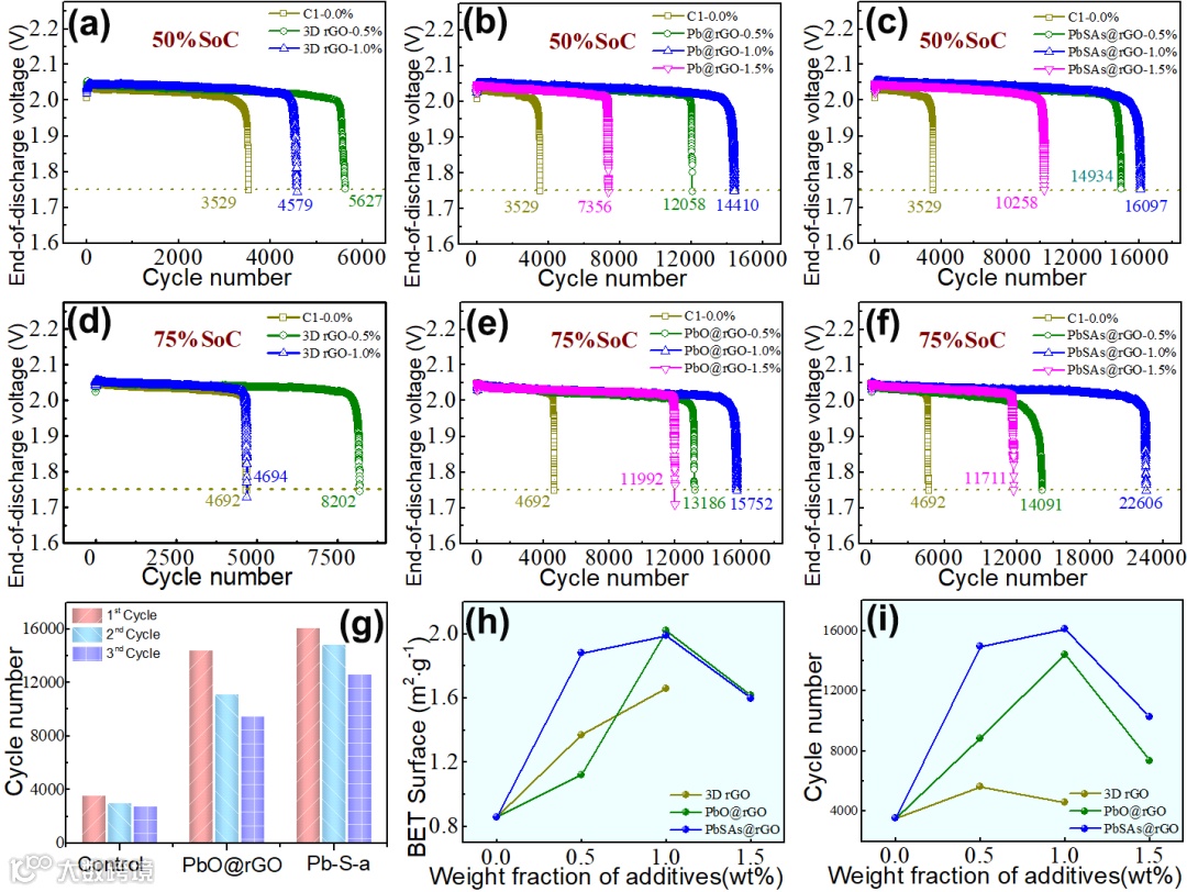 得益于多功能添加剂的组分协同作用,电池在50%荷电状态(SoC)和75%SoC下的工作寿命分别从3529次和4692次提升至16097次和22606次。此外,引入PbSAs@rGO添加剂的电池的倍率性能也得到显著提高。