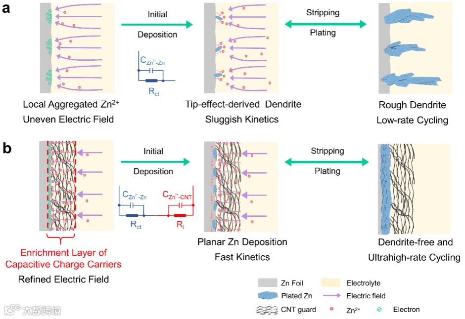 图1. 基于电容式载流子策略构筑的CNTs-Zn界面改善锌沉积行为示意图